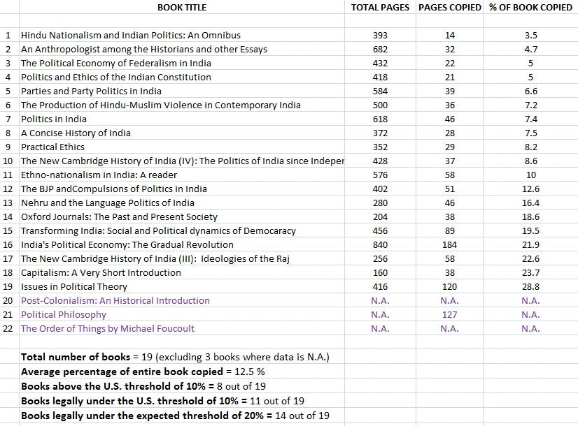 From my conversations with DU students and others that attended court hearings, the court did not at all explore the scope of defences. This order, if in fact passed, appears primarily based only on the few lines relating to the good faith defence, which may have been trumped up as admissions made by DU. Even otherwise, having spent hours and hours meticulously calculating the quantum of reproduction in these course packs and making sure that the majority were under 10% (thereby increasing the likelihood that they would be covered under copyright defences of fair dealing etc), I am perplexed (to say the least) and enraged (at best) that a judge could have come to such a finding (assuming he did actually consider the defences, which I personally very much doubt).