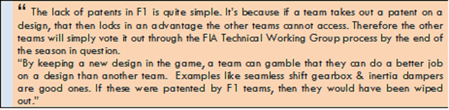 Patenting & F1: James Allen in his blog jamesallenonf1.com invited a F1 engineer to comment on the lack of patents in F1:
