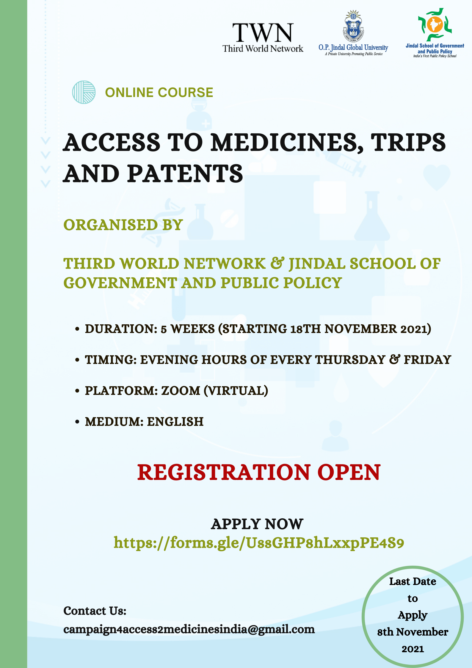 Free Online Course on ‘Access to Medicines, TRIPS and Patents’ [Nov 18-Dec 17; Register by Nov 8]